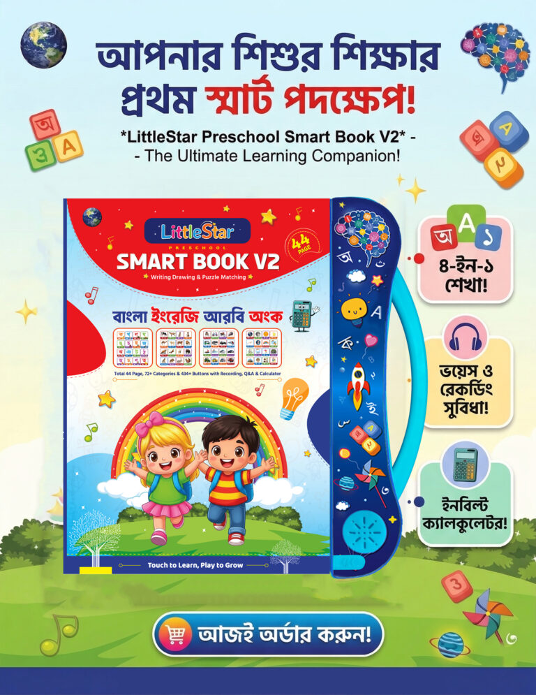 বাচ্চাদের স্ক্রিন আসক্তি কমানোর দারুণ সমাধান! Little Star Smart Book V2 এমন একটি স্মার্ট বই, যার পাতায় স্পর্শ করলেই শোনা যায় শুদ্ধ উচ্চারণের অডিও। বইটির ডানদিকের পৃষ্ঠায় রয়েছে টাচ-অ্যান্ড-প্লে অডিও ফিচার, আর বামদিকের পৃষ্ঠায় রয়েছে বর্ণ বা ছবি ট্রেস করে লেখার চমৎকার প্র্যাকটিস সুবিধা । বাংলা, ইংরেজি, আরবি থেকে শুরু করে সাধারণ জ্ঞান—সবই আছে এই এক বইয়ে!